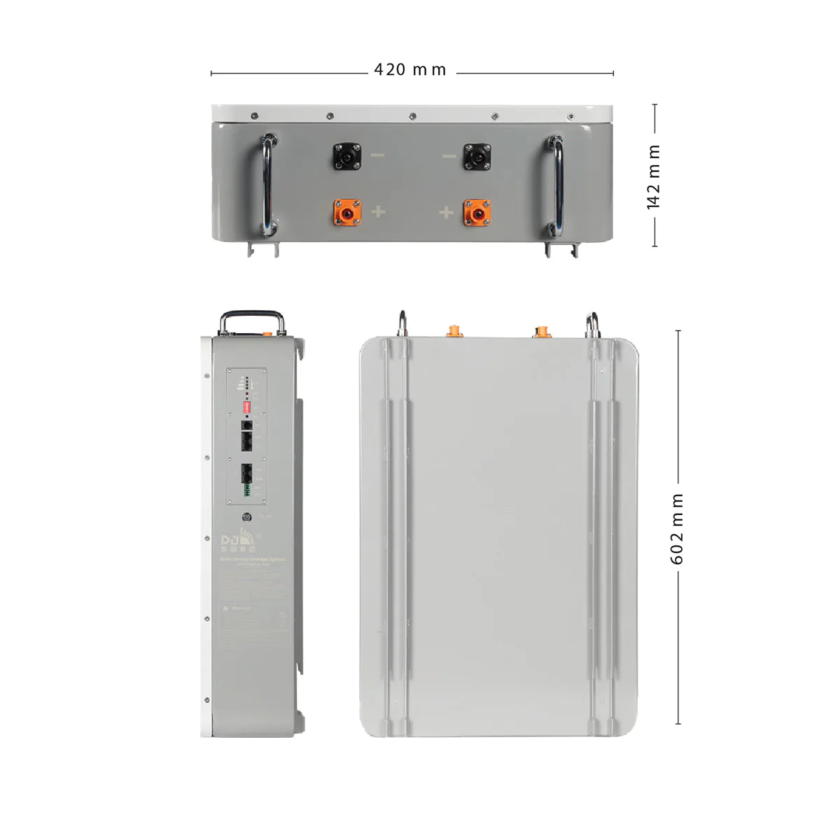 Upgrade your solar energy system with the DJDC 48V 100Ah Wall-Mounted Lithium-ion LiFePO₄ Battery, engineered for performance, reliability, and long service life. With a high energy capacity of 5.12kWh and integrated Smart BMS (Battery Management System), this compact and durable unit is perfect for residential and small commercial solar energy storage applications.